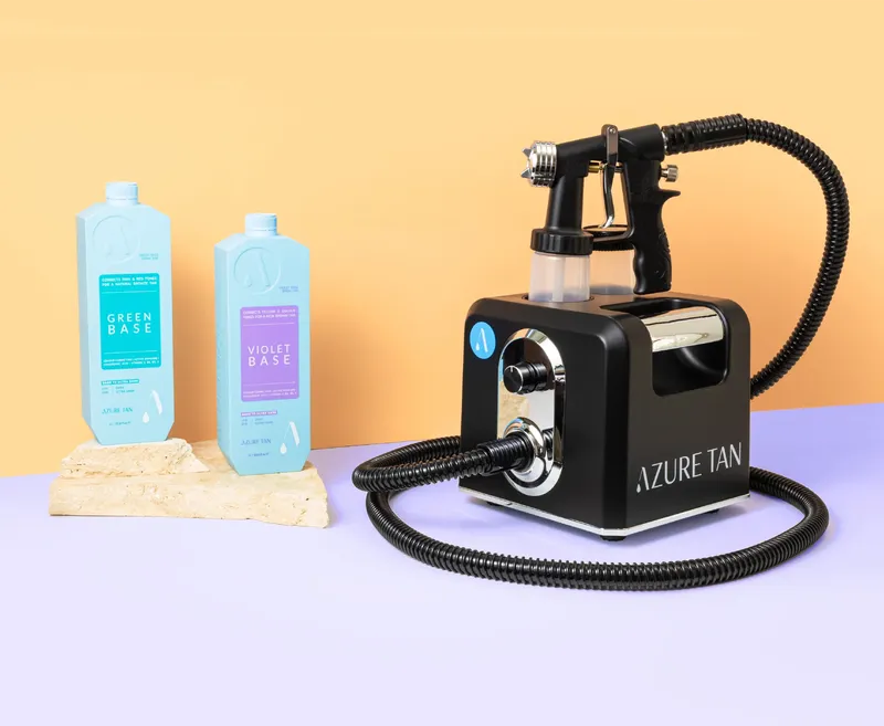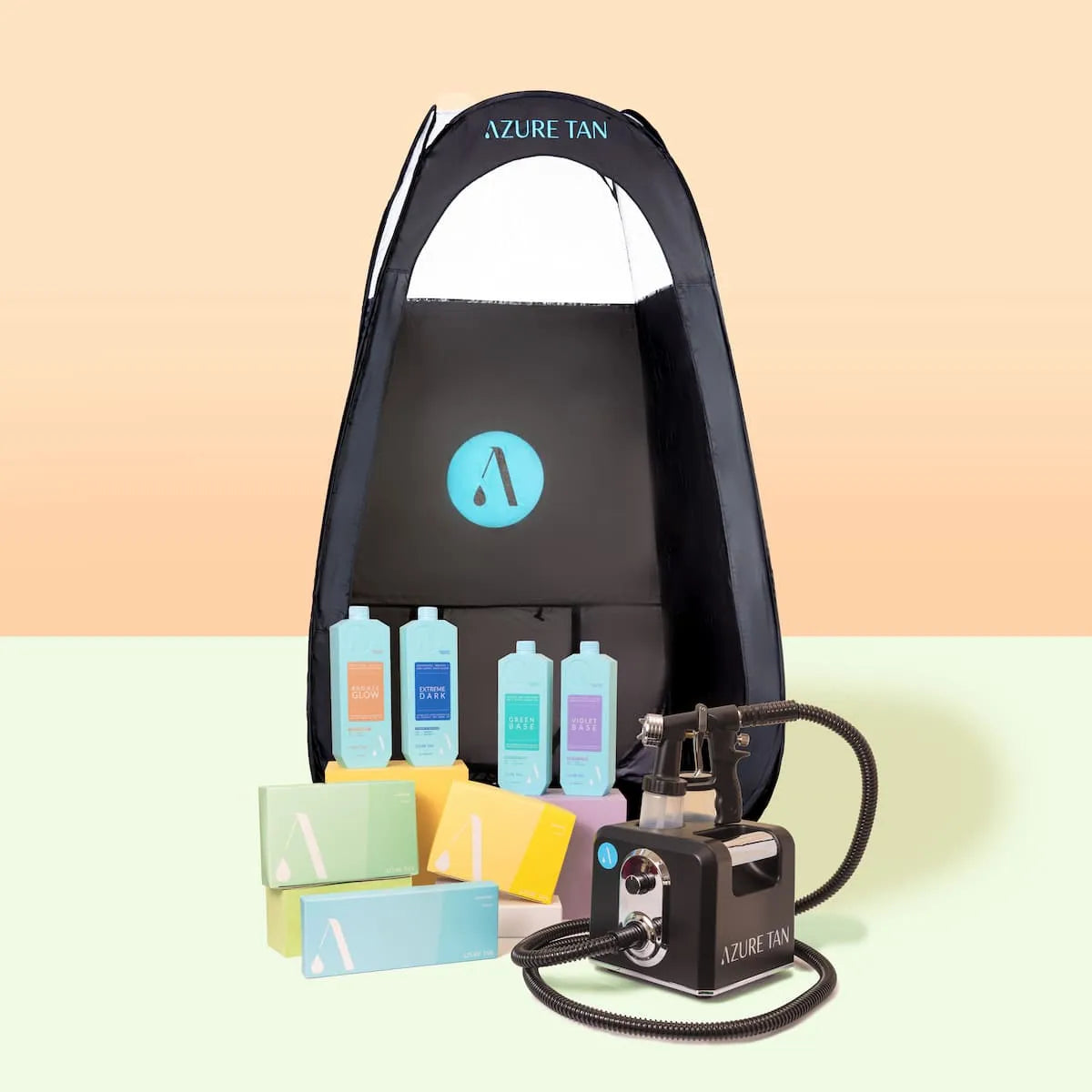The Azure Tan Expert Spray Tan kit features a professional spray tan machine, spray tan tent, portable extraction fan, 8 x pro solutions, perfect for in salon use or mobile spray tanners.